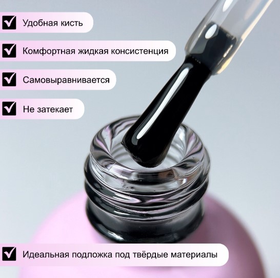За счет жидкой консистенции быстро и равномерно выравнивается и распределяется по ногтевой пластине, при этом не затекает, база заполняет все неровности и недостатки ногтя, создавая гладкую поверхность для дальнейшего покрытия.