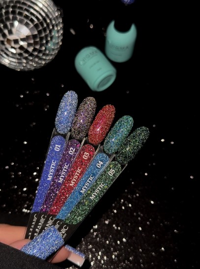 Коллекция гелевых лаков Mystic расширяет основную палитру и не оставляет равнодушными любителей сверкающих ногтей. Глубина мерцания из пяти оттенков, наполнена шиммером и светоотражающими частицами.