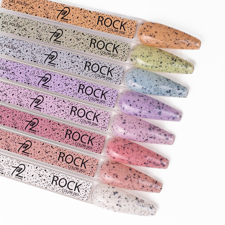 Гель-лаки Ta2 GEL POLISH ROCK — это легкие пастельные оттенки с эффектными черными хлопьями.
