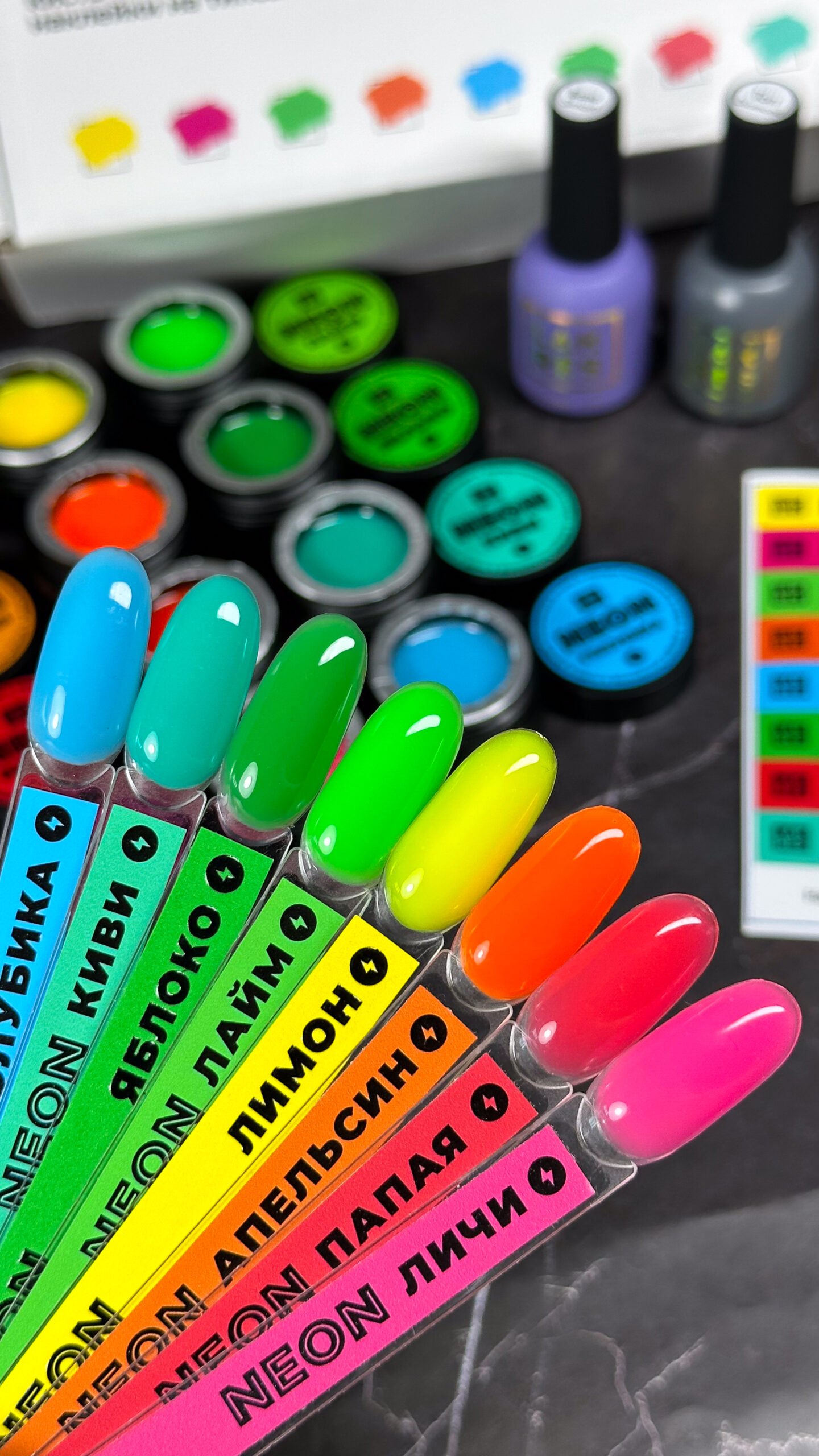 В коллекции 8 ярких оттенков: лайм, лимон, яблоко, папайя, личи, апельсин, голубика, киви.