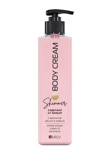 Увлажняющий крем для тела с шиммером «FIRST KISS» от бренда MILV оказывает увлажняющий и тонизирующий эффект. Содержит экстракт моркови и витамин Е. Быстро распределяется, оставляя на коже деликатный сияющий блеск и яркий фруктовой аромат. Смягчает, предотвращает сухость кожи. В летний период способствует более ровному привлекательному загару.