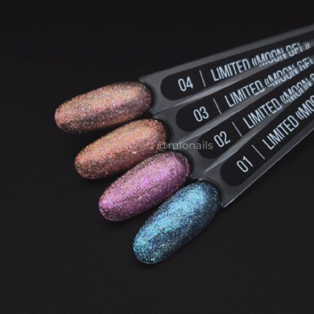 Гель Moon от бренда Mio — шикарная коллекция гелей из 4 оттенков в прозрачной основе, наполненной мерцающими хлопьями, блёстками и шиммером.