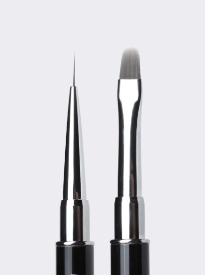 С одной стороны — плоская кисть-лепесток с закругленными краями. Таким инструментом удобно наносить и выравнивать гель. С другой стороны — кисть-волосок для детальной проработки труднодоступных мест.