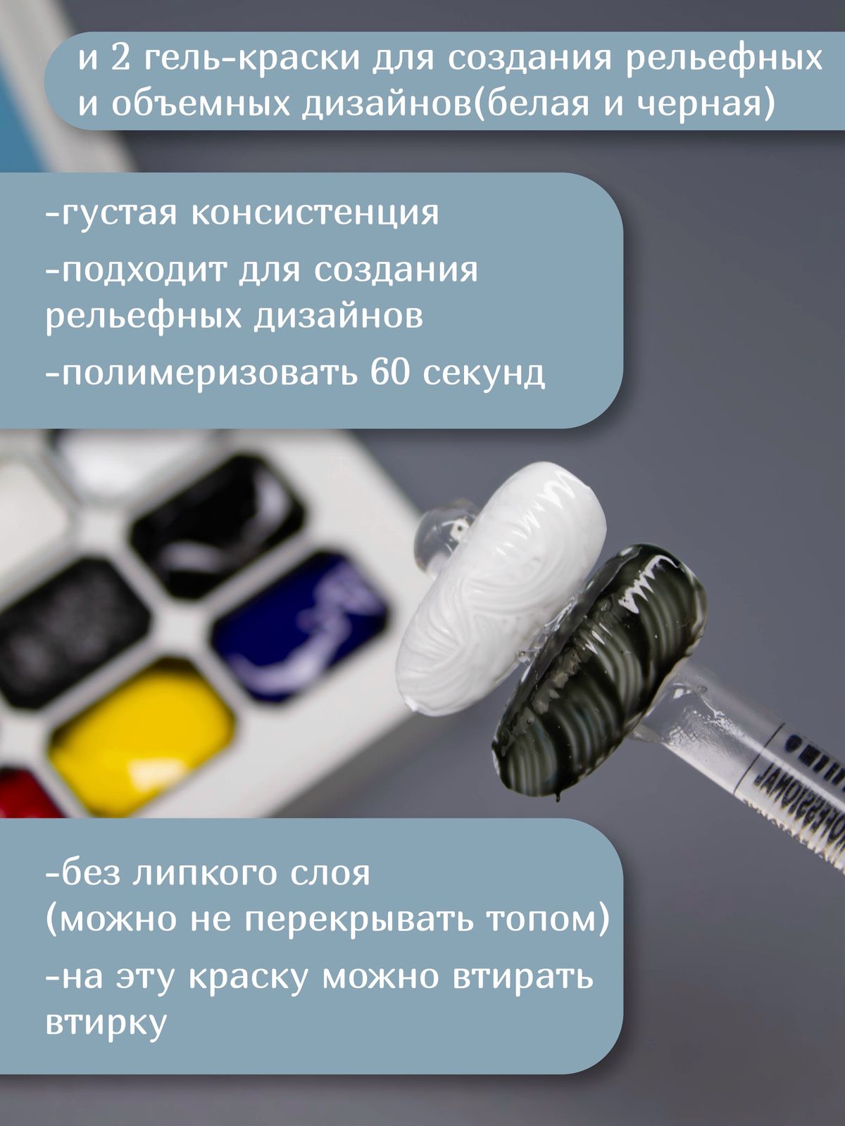 3 черных гельь-краски: гипс, гель-краска для выпуклых дизайнов и гель -краска для прорисовки линий.
