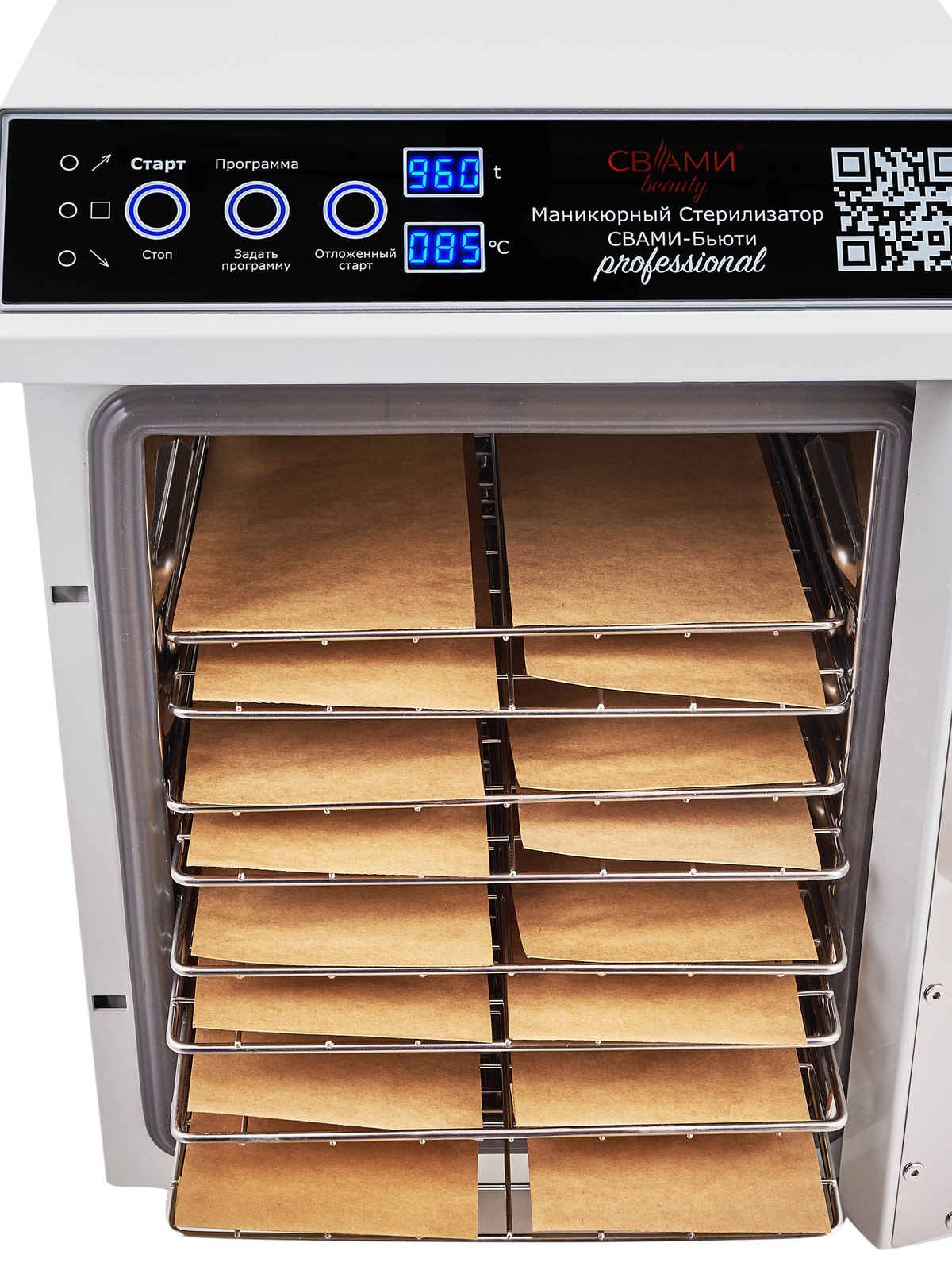 В стерилизаторе СВАМИ БЬЮТИ ГП-20 Про Комфорт предусмотрена система звуковой и световой сигнализации режимов работы. ДЛЯ КОМФОРТНОГО ОБОЗРЕНИЯ ПАНЕЛЬ НАКЛОНЕНА под углом.