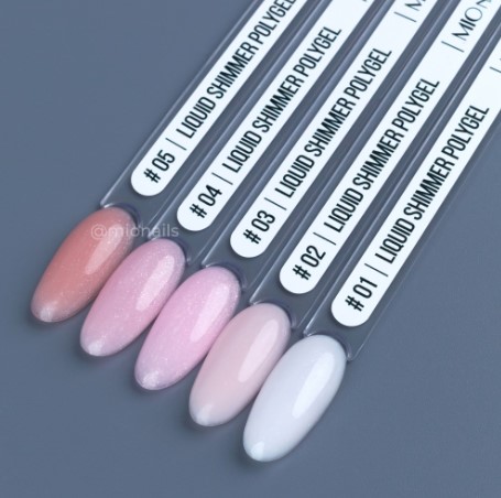Liquid POLYGEL SHIMMER — жидкий полигель c шиммером, гибрид моделирующего геля и акрила. В линейке 5 натуральных оттенков, включая молочный.