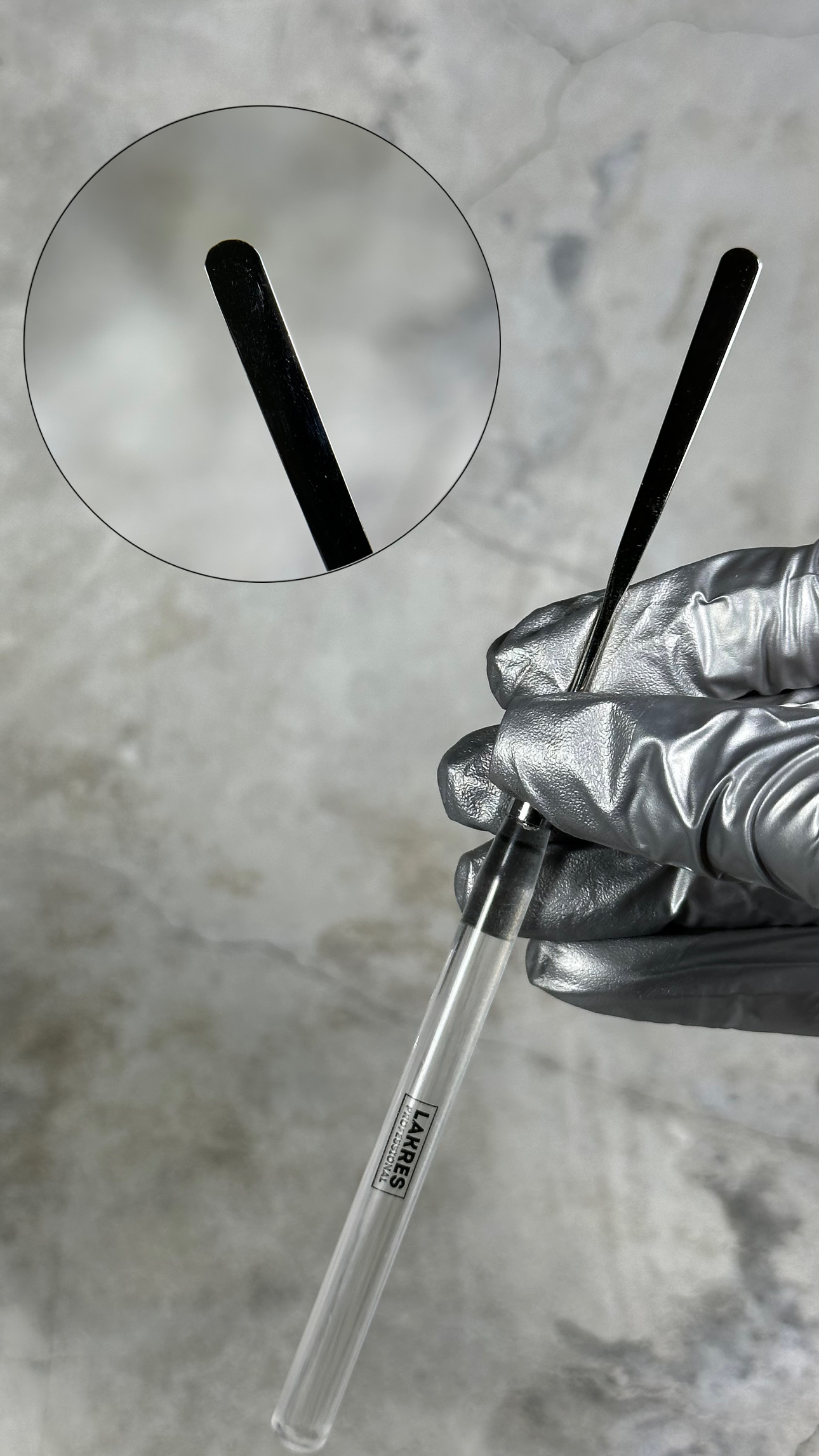 С помощью удобной длины инструмента можно легко осуществить набор материала из флакона без остатка.