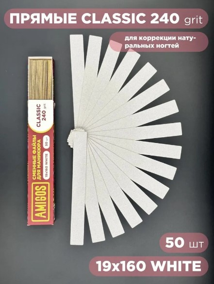 Одноразовые прямые сменные файлы для металлической основы AMIGOS. Абразивность 240 грит применяется для коррекции натуральных ногтей. Изготовлены из высококачественного абразива (карбид кремния), устойчивого к быстрому истиранию и имеющему минимальную осыпаемость в момент использования. Прочный клеевой слой отлично держит файл на основе, но при этом, легко отделяется после применения, не оставляя следов клея на поверхности.