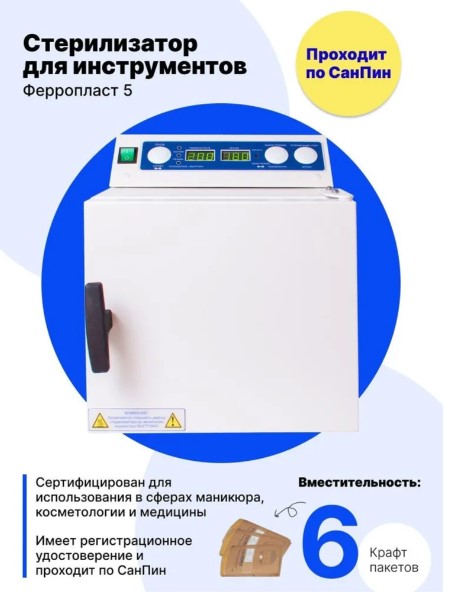 Стерилизатор медицинский Ферропласт предназначен для воздушной стерилизации термическим способом медицинского и маникюрного инструмента, стеклянной посуды и прочих косметических принадлежностей, теплоустойчивых до 200°С. В стерилизаторе предусмотрены режимы работы для дезинфекции и сушки косметологического инструмента и термостойких принадлежностей.