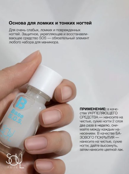 База SOUL BASE SOS. — защитное, укрепляющее и восстанавливающее средство для сильно поврежденных ногтей. Обязательный элемент любого набора для маникюра.
