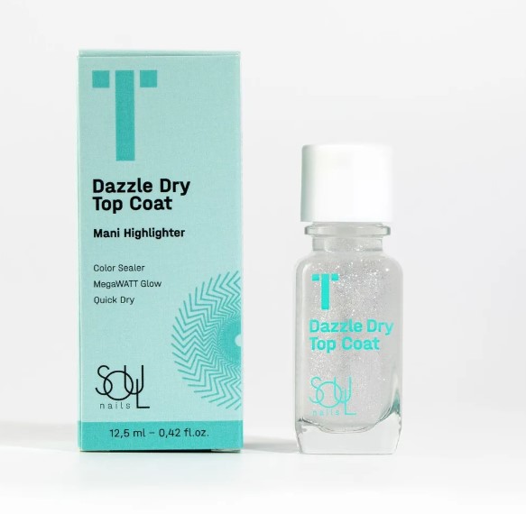 SOUL Dazzle Dry Top Coat — верхнее покрытие с мелкими блёстками в составе. Топ защищает покрытие от сколов и сохраняет цвет, создавая гладкую поверхность без использования лампы.