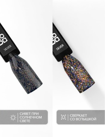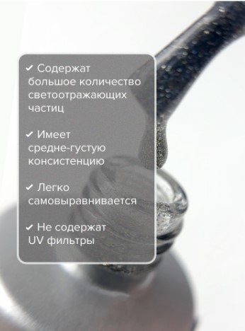 — Содержат большое количество светоотражающих частиц, которые равномерно распределяются по всей поверхности ногтя (не тянутся за кистью). Можно регулировать плотность нанесения частиц, легко корректируются тонкой кистью.