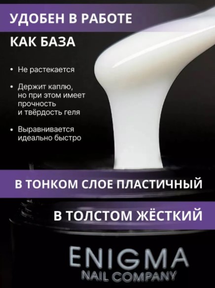 Enigma SMART Liquid gel-абсолютно безопасный, быстрый, комфортный, бескислотный жидкий гель. Он сочетает в себе твёрдость и прочность как у геля и лёгкость нанесения как у базы.