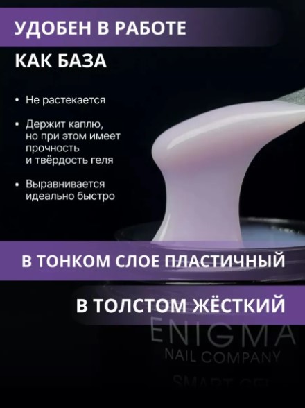 Enigma SMART Liquid gel-абсолютно безопасный, быстрый, комфортный, бескислотный жидкий гель. Он сочетает в себе твёрдость и прочность как у геля и лёгкость нанесения как у базы.
