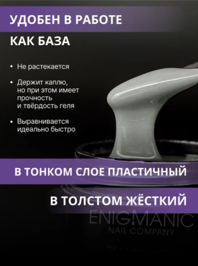 Enigma SMART Liquid gel-абсолютно безопасный, быстрый, комфортный, бескислотный жидкий гель. Он сочетает в себе твёрдость и прочность как у геля и лёгкость нанесения как у базы.