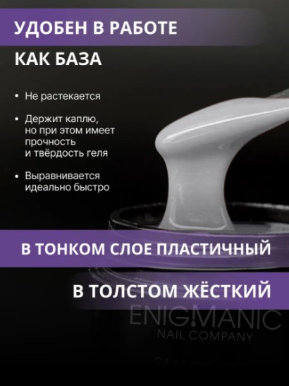 Enigma SMART Liquid gel-абсолютно безопасный, быстрый, комфортный, бескислотный жидкий гель. Он сочетает в себе твёрдость и прочность как у геля и лёгкость нанесения как у базы.