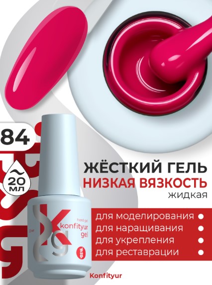 Жёсткий гель в бутылке Konfityur №84 НИЗКАЯ ВЯЗКОСТЬ — Ярко-розовый с малиновой ноткой (20 мл)